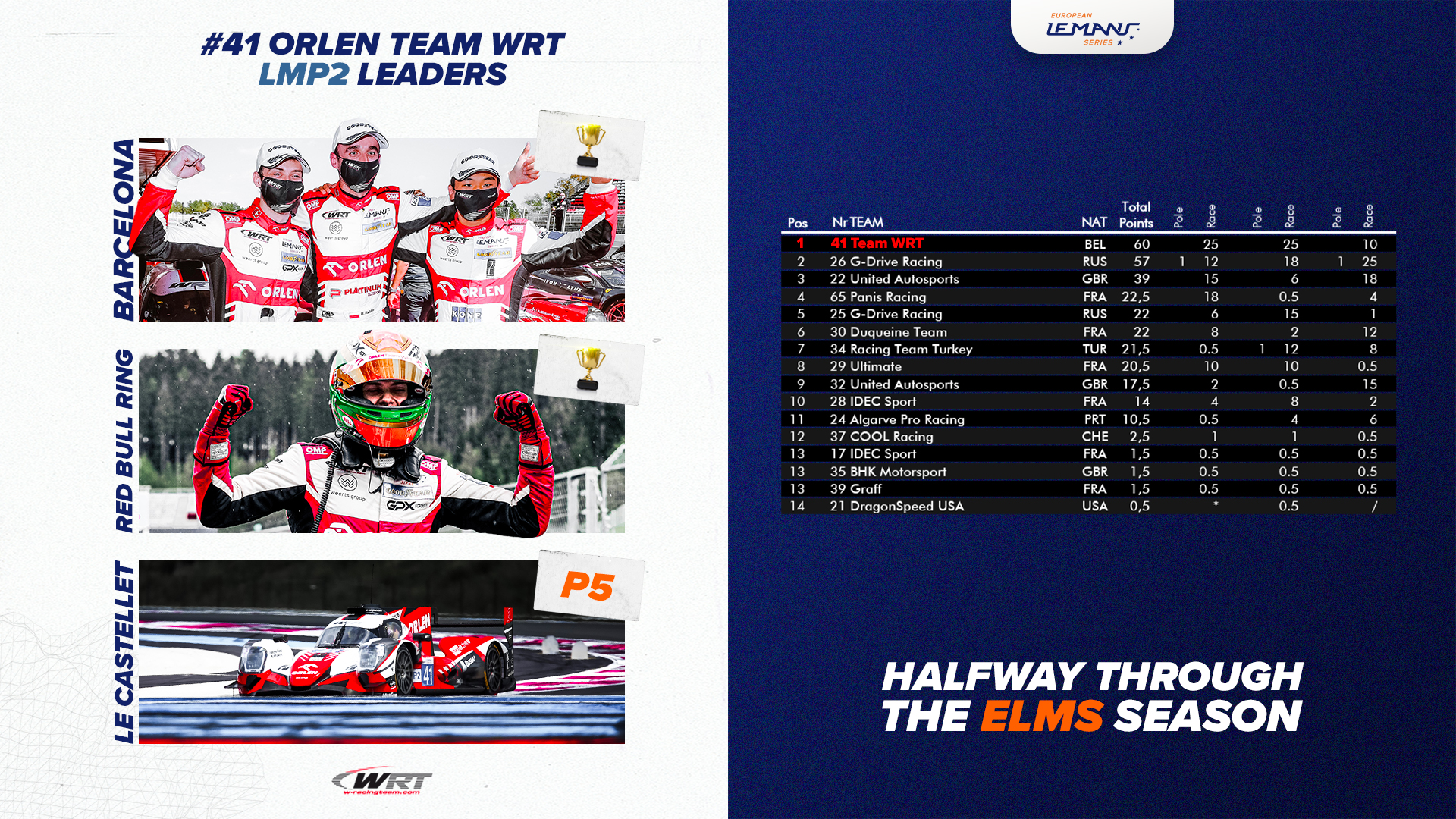 In the LMP2 class, Orlen Team WRT (Oreca #41) is heading the championship classification for its first full ELMS season. Robert Kubica, Louis Deletraz and Yifei Ye are now on 60 points after taking the win at Barcelona and the Red Bull Ring. A victory at Le Castellet has allowed the n°26 G-Drive Racing Aurus 01 to come back with 57 points, only three points behind the Belgian team.