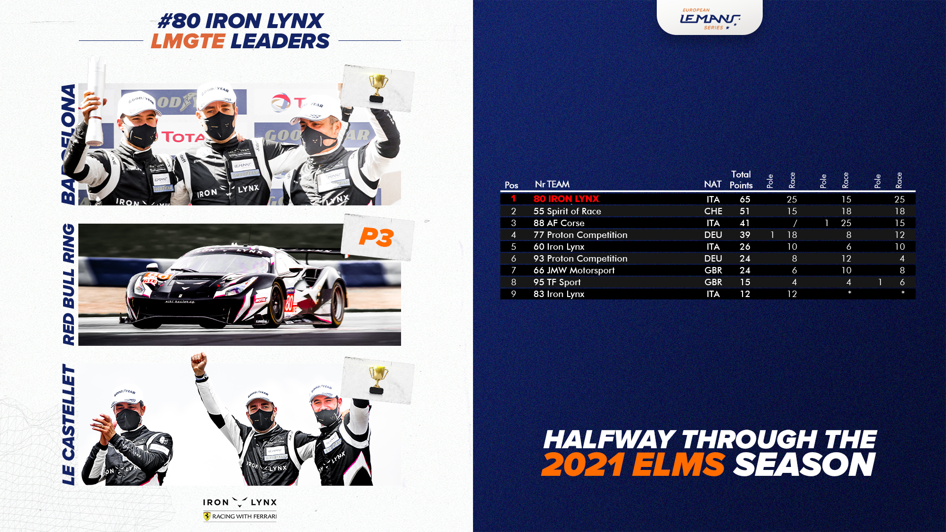 Finally, the LMGTE class is topped by a trio of Ferrari. First, the n°80 Iron Lynx Ferrari 488 GTE EVO of Matteo Cressoni, Rino Mastronardi and Miguel Molina with 65 points. Right behind, with 51 points is the n°55 Spirit of Race Ferrari and the n°88 AF Corse Ferrari with 41 points.