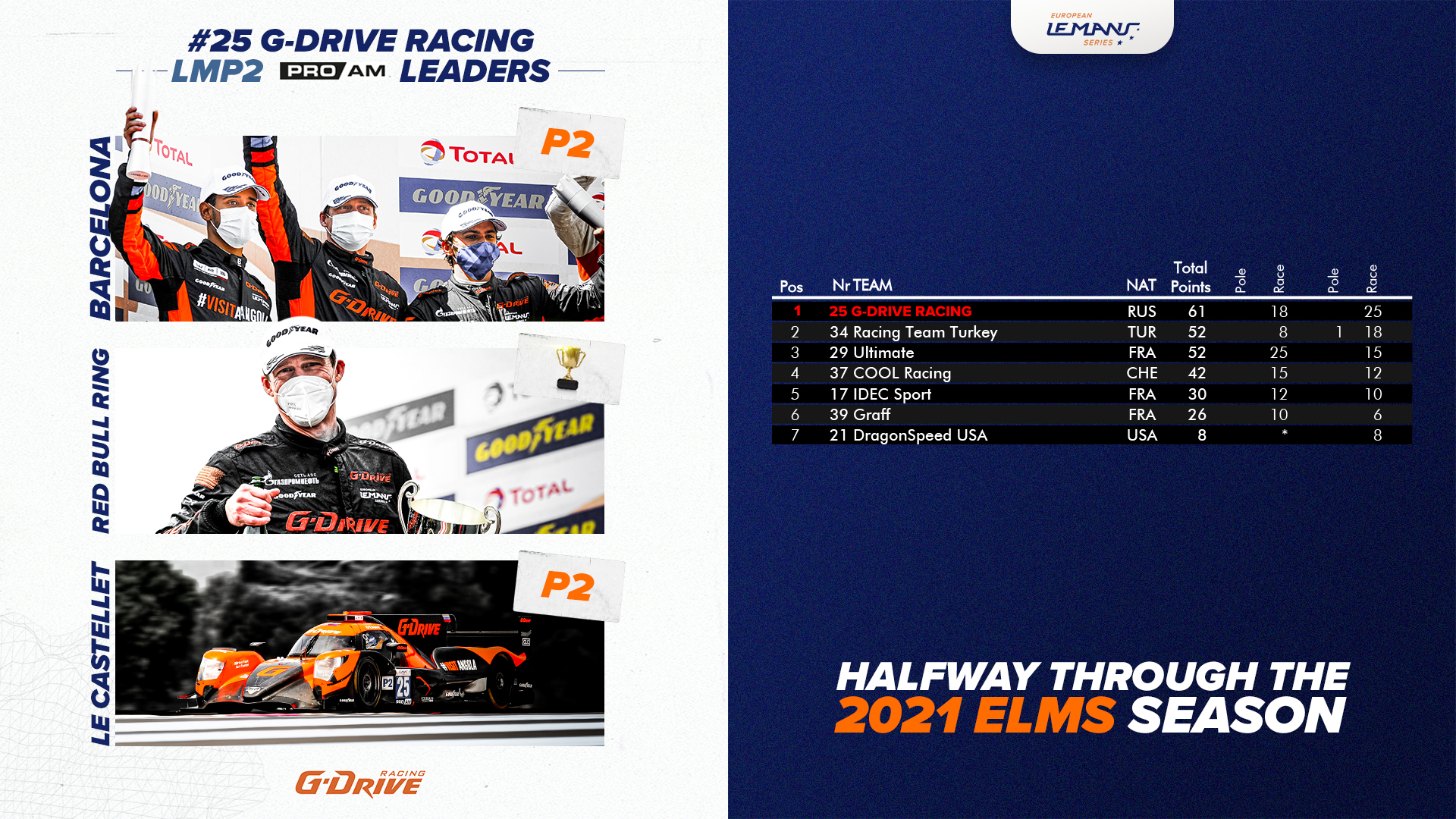The new LMP2 Pro/ Am classification is dominated by the n°25 G-Drive Racing Aurus 01 with 61 points followed by the n°34 Racing Team Turkey Oreca 07 and the n°29 Ultimate Oreca 07 both tied on 52 points.