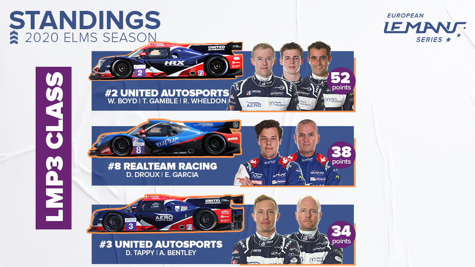 While United Autosports are leading LMP2, the British team are also out in front in the LMP3 category with the no2 Ligier of Rob Wheldon, Tom Gamble and Wayne Boyd on 52 points, 14 points ahead of their nearest rivals David Droux and Esteban Garcia in the no8 Realteam Racing Ligier.