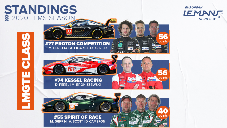 While there are clear leaders in the LMP2 and LMP3 categories, the same cannot be said in the LMGTE class with the top two cars tied on 56 points, each with one win, one second, one fourth and one pole position. The no77 Proton Competition Porsche of Alessio Picariello, Christian Ried and Michele Beretta is classified in first place thanks to their victory in Round 1, while the no74 Kessel Racing Ferrari is classified second with Michael Broniszewski and David Perel looking to move ahead of their rivals in Italy.