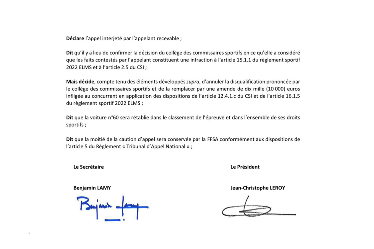 The National Appeals Tribunal declares the appellant's appeal admissible. It states that the decision of the stewards' panel should be confirmed since it considered that the facts contested by the appellant constituted an infringement of article 15.1.1 of the 2022 European Le Mans Series sporting regulations and of article 2.5 of the ISC; but decides, taking into account the elements developed above, to cancel the disqualification pronounced by the Stewards' Panel and to replace it by a fine of 10,000 Euros imposed on the competitor in application of the provisions of article 12.4.1.c of the ISC and of article 16.1.5 of the 2022 European Le Mans Series sporting regulations. The #60 car will be reinstated in the event standings and in all its sporting rights. Half of the appeal deposit will be retained by the FFSA in accordance with the provisions of article 5 of the "National Appeal Tribunal" regulations.